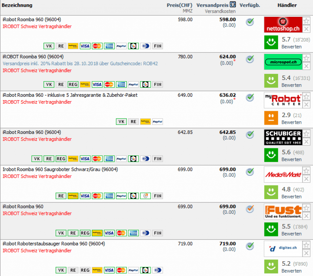 Bei nettoshop gibt es aktuell den Roboterstaubsauger IROBOT Roomba 960 für 598.- CHF.