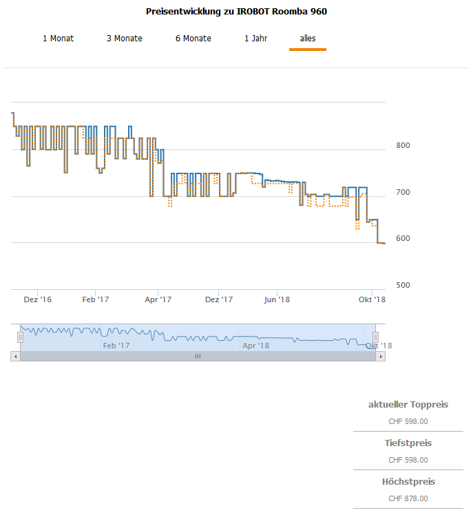 Gemäss toppreise gab es den Staubsauger bislang nie günstiger als für 629.53 CHF, der zweitbeste Preis liegt aktuell bei 624.- CHF.