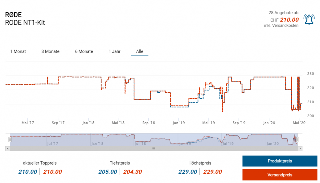 Bei amazon.de gibts gerade das Kondensator-Mikrofon Set NT1 von Rode in Aktion. So zahlt ihr am Ende des Bestellvorgangs ca. 174 Franken anstatt CHF 210.- beim günstigsten Schweizer Händler. Der Bestpreis lag laut toppreise in der Vergangenheit bei knapp 205 Franken.