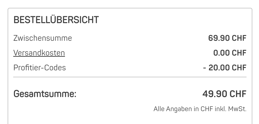 Mit dem Gutscheincode aus dem Ackermann Deal: CHF 20.- Rabatt ab CHF 60.- Bestellwert spart Ihr nochmals CHF 20.- (Diesen könnt ihr ihm letzten Bestellschritt eingeben)