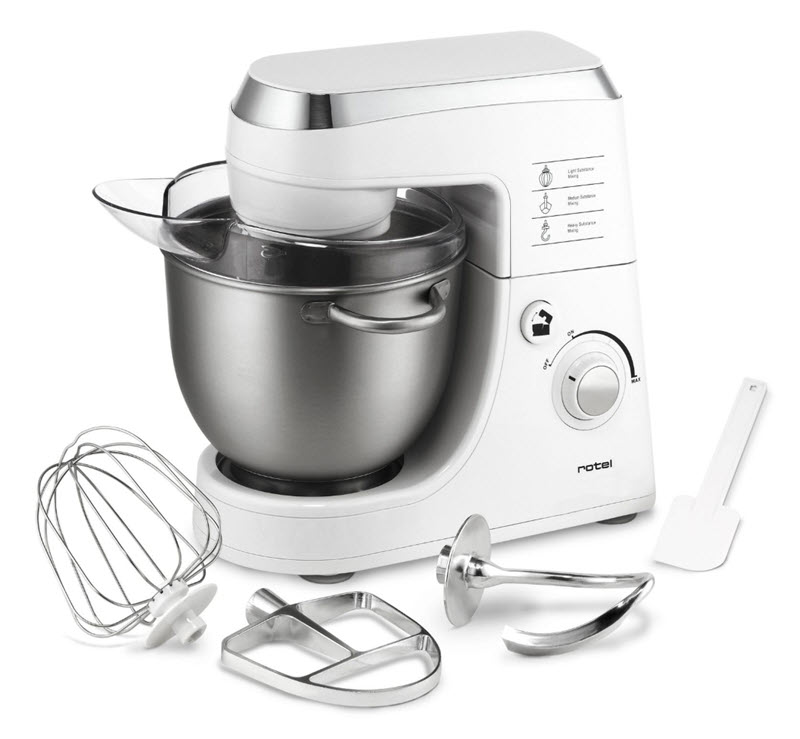 Kraftvolle Küchenmaschine mit grosser Chromstahl-Schüssel (4 Liter). Mit Knethaken und zwei Schwingbesen zum einfachen Mixen, Rühren und Kneten. Mit Spritzschutzabdeckung und stufenloser Geschwindigkeitskontrolle. Sicherheitsverriegelung, einfaches Anheben des Armes.