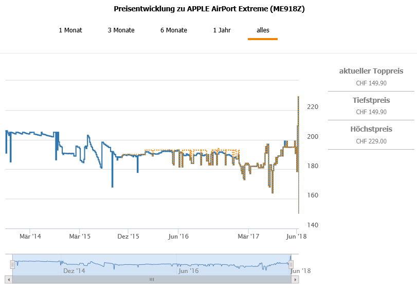 Bei Fust bekommt ihr gerade den APPLE AirPort Extreme Router für 149.90 CHF (leider aktuell kein Bestand, aber dennoch bestellbar).