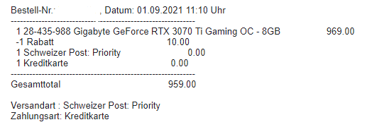 Vielen Dank für den Gutschein. Macht doch schon wieder ein paar Franken aus. 939 CHF für eine 3070 Ti dürfte im Moment ziemlich konkurrenzlos sein bei sofort lieferbaren Karten