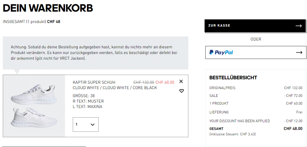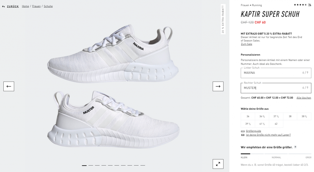 Ein grosser Vorteil bei Adidas: Ihr könnt die Schuhe noch mit einem Text personalisieren! Es wird zwar angezeigt, dass dies zusätzlich kostet. Allerdings wird beim Checkout der Normalpreis angezeigt!