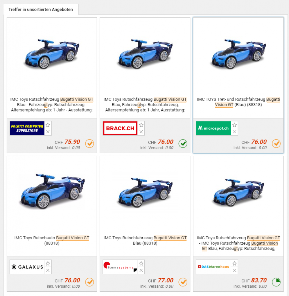 Bei melectronics gibts derzeit im Rahmen der 30% Aktion das Rutscherauto Bugatti Vision GT zum neuen Bestpreis von unter 50 Franken. Den Dealpreis erreicht ihr, wenn ihr euch zum Newsletter anmeldet und den daraus resultierenden Bon ab einem Mindestbestellwert von 50 Franken anwendet, Versandkosten miteinberechnet. Den Füllartikel, um die 50 Franken Mindestbestellwert zu erreichen, gibts hier.