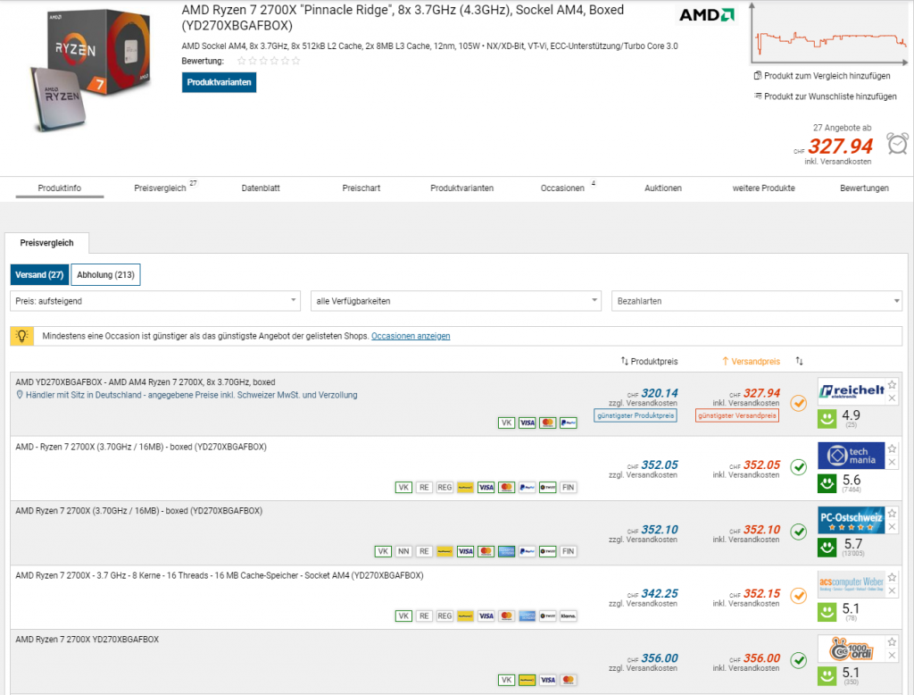 habe den 2700x am 05.2018 zum regulären Preis bei Pc-Ostschweiz für 298.3.- gekauft, nun knapp ein Jahr später ist er ziemlich teurer geworden anscheinend.
