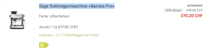 So gibt es die Sage Siebträgermaschine »Barista Pro« zum Aktionspreis von 370.20 Franken.
