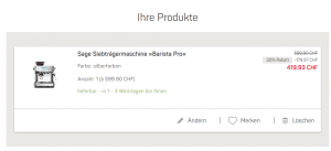 Bei Ackermann bekommt ihr aktuell die SAGE The Barista Pro zum neuen Bestpreis von CHF 419.93! Der aufgeführte Gutscheincode kann für den Artikel verwendet werden. So kommt ihr auf den besagten Preis im Deal: