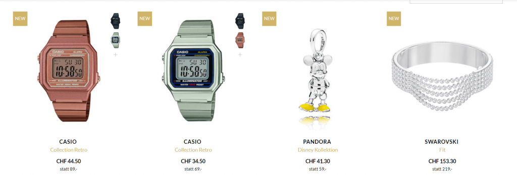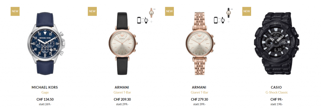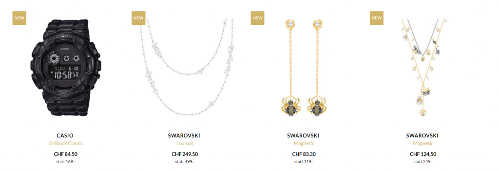 Hier findest du zahlreiche verschiedene Produkte. Zum Beispiel gibt es einige Uhren von bekannten Marken wie Boss oder Michael Kors, aber auch Schmuck wird im Sale angeboten. Dazu zählen etwa Ohrringe und Ketten, aber auch Armbänder und Ringe. Ebenso gibt es eine kleine Auswahl an Anhängern für Ketten oder Schlüsselbund.