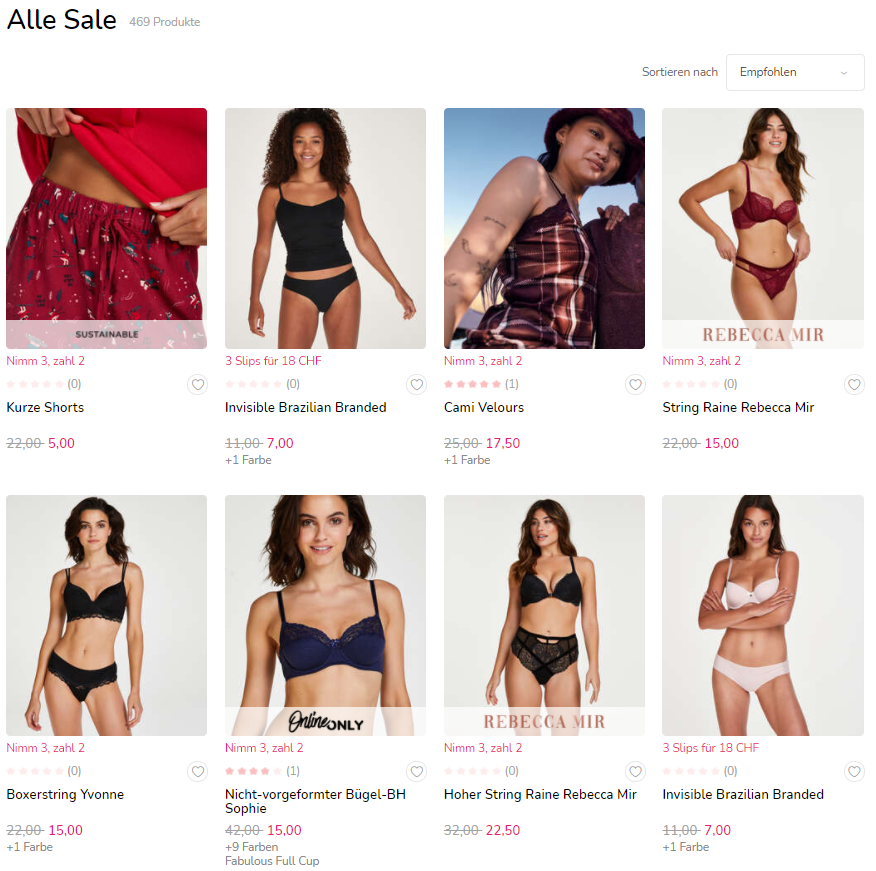 Bei Hunkemöller gibts derzeit ebenfalls einen Sale mit diversen Aktionen. So werden einerseits Rabatte bis zu 70% beworben, andererseits gibts auch viele 3für2-Aktionen.