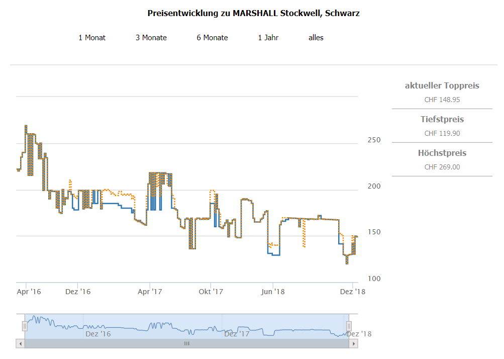 Es gibt einige gute Angebote. Für mich sticht der Marshall Stockwell Bluetooth Lautsprecher für CHF 99.- heraus. Zweitbester Preis in der Schweiz beträgt momentan CHF 148.95, Bestpreis war laut toppreise bei CHF 119.90