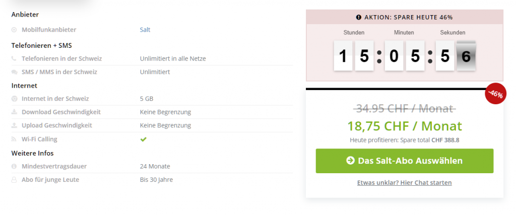 Bei Handy-Abovergleich gibt’s gerade das Salt-Abo Basic Young für 18.75 pro Monat. Die Mindestvertragsdauer beträgt 24 Monate. Das Abo gilt nur für Personen unter 30 Jahre.