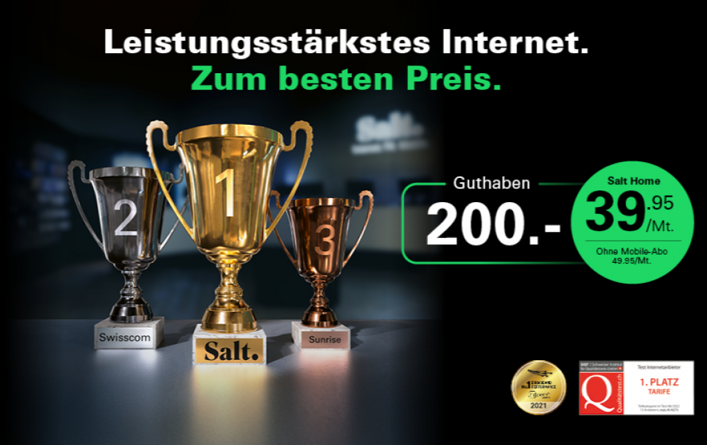Neue Kunden erhalten das Salt Fiber für CHF 49.95 / Monat. Hinzu kommen hier auch der Willkommenbonus von CHF 200.- und Cashback von CHF 35.- durch einsetzten des Gutscheincodes alaoPP5. Die Aktivierung von CHF 99.- wird euch geschenkt. Somit kommt ihr über eine Vertragslaufzeit von 24 Monaten auf einen monatlichen Abo-Preis von CHF 35.99 / Monat. Was auch ein guter Preis ist.