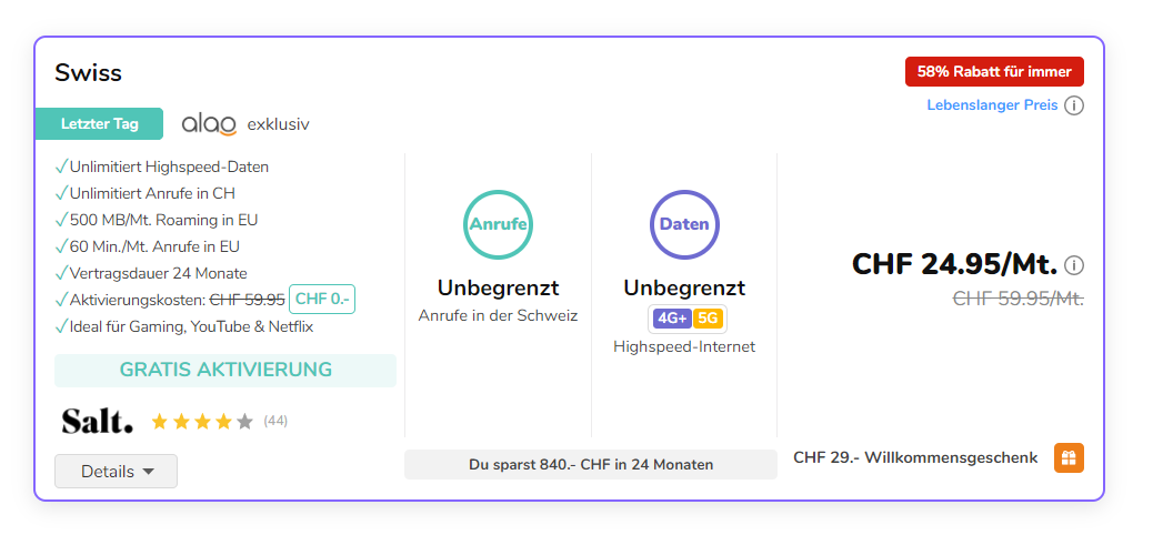 Bei Alao gibts derzeit das Mobilabo Salt Swiss zu besseren Konditionen als über handyabovergleich.