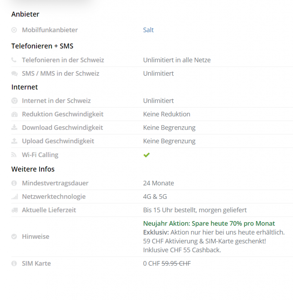 Bei handy-abovergleich.ch gibts derzeit das Abonnement Smart Swiss mit unlimitiert Daten, Anrufen und SMS in der Schweiz für unter 20 Franken! Ausserdem ist die SIM-Aktivierung geschenkt. Zusätzlich erhält man nach Zustellung der SIM Karte von Handy-Abovergleich einen Cashback in Höhe von CHF 55.- aufs Konto überwiesen. Das klappt nur, wenn man auf Preispirat auf „Zum Deal“ klickt - sonst gibt’s den Cashback nicht. Der Rabatt gilt lebenslang.