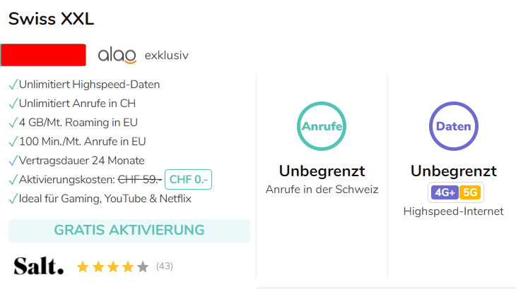 Bei alao.ch gibts derzeit ein sehr gutes Angebot mit einem kleinen Goodie ontop, exklusiv für uns Preispiraten 😉 Ihr kriegt dabei das Abonnement Swiss XXL von Salt zum Preis von CHF 24.95 pro Monat. Dazu werden die Aktivierungsgebühren von 59 Franken geschenkt, 29 Franken Cashback sowie nochmal 25 Franken geschenkt, wenn ihr den Code “alao7” eintragt. Die Mindestvertragsdauer beträgt hierbei 24 Monate, macht pro Monat ausgerechnet einen Betrag von CHF 22.70 (die Aktivierungsgebühren werden meistens bei allen Anbietern auf Nachfrage geschenkt).