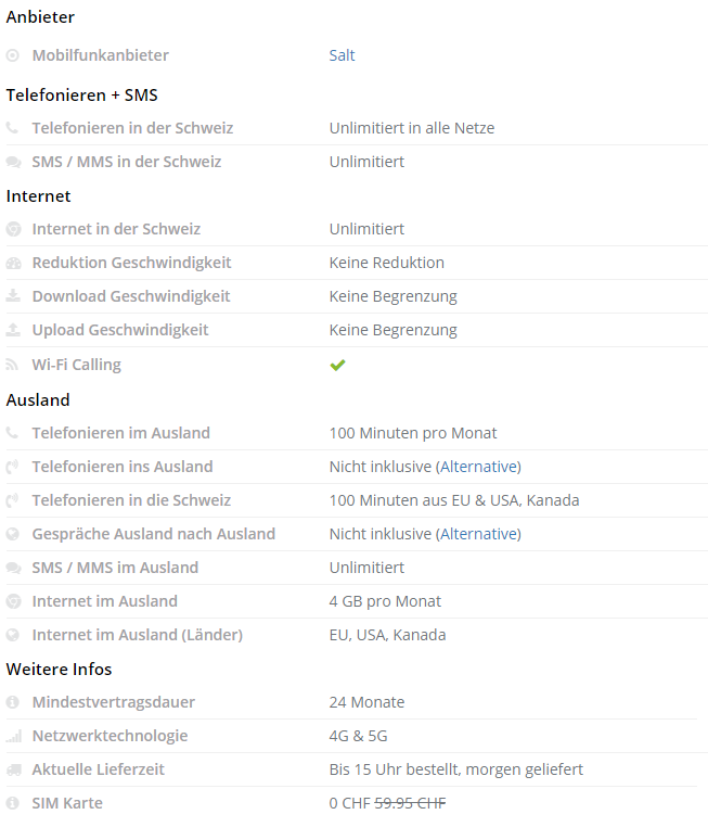 Bei handy-abovergleich.ch gibts derzeit das grosse Mobilabonnement Salt Swiss XXL zum gleichen Preis wie am Black Friday. Wenn ihr dabei über diesen Link geht, werden euch die Aktivierungskosten vollends erlassen.