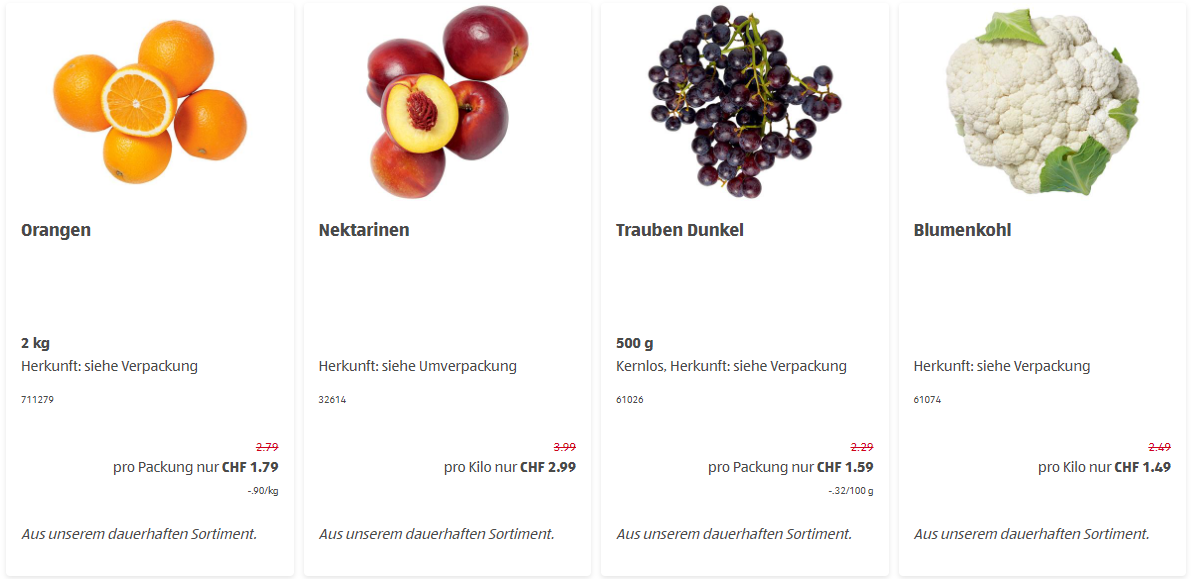 Bei Aldi gibt’s weiterhin bis heute: 2kg Orangen für CHF 1.79, Nektarinen für CHF 2.99 pro kg, 500g dunkle Trauben für CHF 1.59 sowie Blumenkohl für CHF 1.49 pro kg!
