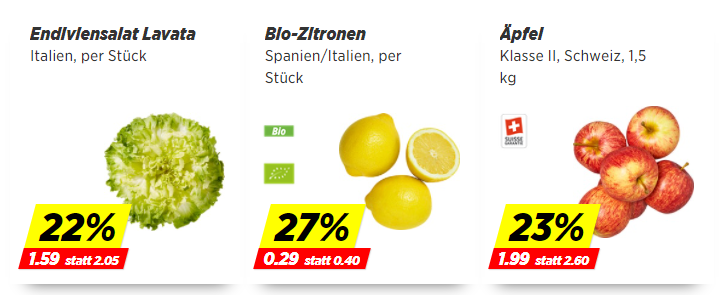 Bei Denner gibt’s diese Woche Schweizer Äpfel für 1.99 Franken pro 1.5kg Packung, Bio-Zitronen für 29 Rappen pro Stück, Cherry-Rispentomaten für 1.85 Franken pro 500g-Packung sowie Ediviensalat Lavata für 1.59 Franken und Eisbergsalat für 79 Rappen pro Stück.