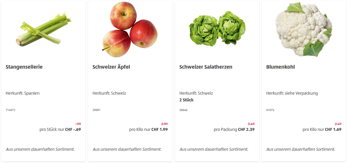 Ab dem 21.4. folgen dann die neuen Angebote. Ihr findet wieder 2kg Orangen für 1.59 Franken, 1kg Frühkartoffeln für 1.29 Franken sowie Cantaloupmelonen für 1.99 Franken pro Stück.