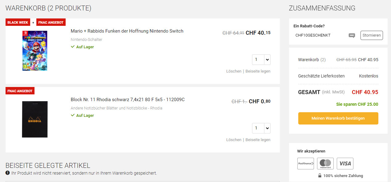 Switch Spiel Mario + Rabbids: Sparks of Hope (49.95) + Füllartikel Notizblock (1.-) minus Fr. 10.- Gutscheincode macht noch 40.95 für das Spiel. Nächster Preis gem. Toppreise bei Fr. 52.-