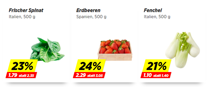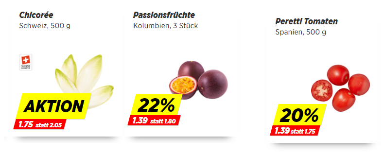 Bei Denner sind diese Woche wieder weniger interessant. Es gibt 500g Chicorée für 1.70 Franken, Passionsfrüchte für 1.39 Franken pro 3er-Pack, frischen Spinat à 500g für 1.79 Franken, Fenchel à 500g für 1.10 Franken, Peretti-Tomaten für 1.39 Franken pro 500g sowie 500g Erdbeeren für 2.29 Franken.