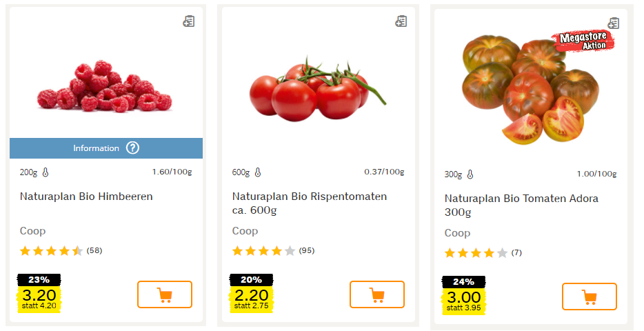 Zuletzt noch Coop, wo es diese Woche viele Bio-Produkte in Aktion gibt. So kostet euch der Bio-Eisbergsalat noch 1.50 Franken pro Stück, Bio-Äpfel für 3.90 Franken (einmal ohne Gewichtsangabe, einmal 750g), Bio-Himbeeren für 3.20 Franken pro 200g, Bio-Rispentomaten für 2.20 Franken pro 600g sowie die Bio-Tomaten „Adora“ für 3 Franken pro 300g (nur in den Megastores).
