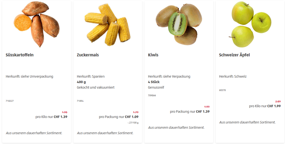 Bis zum 16.3. gibt’s bei Aldi nun 1kg Süsskartoffeln für 1.39 Franken, 400g Zuckermais für 1.09 Franken, 4 Stück Kiwis für 1.39 Franken sowie Schweizer Äpfel für 1.99 Franken pro kg.