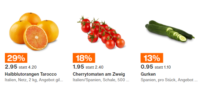 Bei der Migros gibt’s diese Woche die beliebten Tarocco Halbblutorangen à 2kg-Säcke für 2.95 Franken. Ebenfalls in Aktion sind Cherry-Tomaten für 1.95 Franken pro 500g (20 Rappen teurer als bei Coop) und Gurken für 95 Rappen.