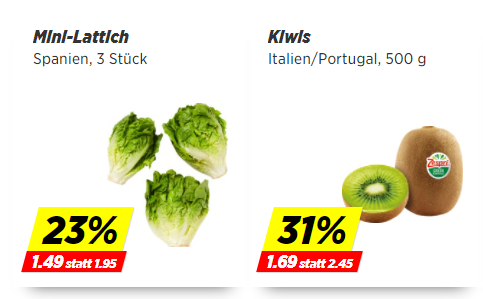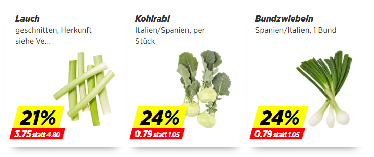Bei Denner gibt’s diese Woche wieder einmal Bundzwiebeln für günstige 79 Rappen pro Bund, Kohlrabi für 79 Rappen pro Stück, Lauch für 3.75 Franken pro kg, Mini-Lattiche für 1.49 Franken pro 3er-Pack und Kiwis für 1.69 Franken pro 500g-Packung.