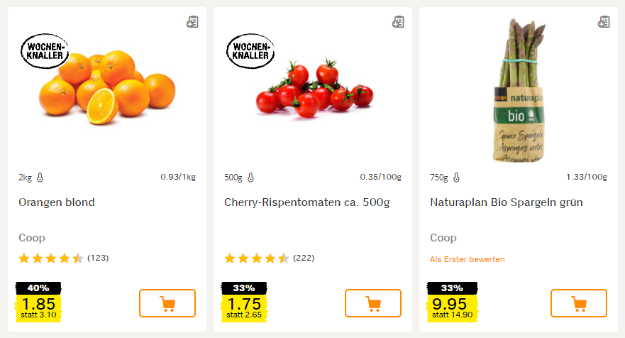 Zuletzt noch Coop, wo es diese Woche weiterhin etwas weniger, aber doch einige Bio-Produkte in Aktion gibt. So sind Bio-Zucchetti weiterhin in Aktion für 1.75 Franken pro 500g, Bio-Fairtrade-Bananen gibt’s für 2.60 Franken pro kg, Bio Gala Äpfel kosten 5.30 Franken pro kg, Bio Zitronen für CHF 1.75 pro 750g, Bio Spargeln für CHF 9.95 pro 750g sowie Bio Tarocco Orangen für CHF 2.75 pro kg. Die Cherry-Rispentomaten sind mit 1.75 Franken günstiger als bei Migros, dürften aber trotzdem teurer als bei Lidl/Aldi ohne Aktion sein. Auch die Blond-Orangen sind in 2kg-Säcken bei Coop in Aktion für CHF 1.85, kosten aber auch wieder 26 Rappen mehr als bei Lidl.