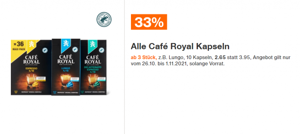 33% Rabatt auf alle Café Royal Kapseln bei Migros ab 3 Stück (Gültig bis zum 01.11.2021 nur solange Vorrat)