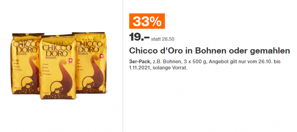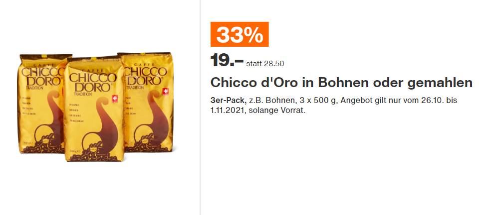 33% auf Chicco d’Oro in Bohnen oder gemahlen in der Migros (Gültig bis zum 01.11.2021 nur solange Vorrat)