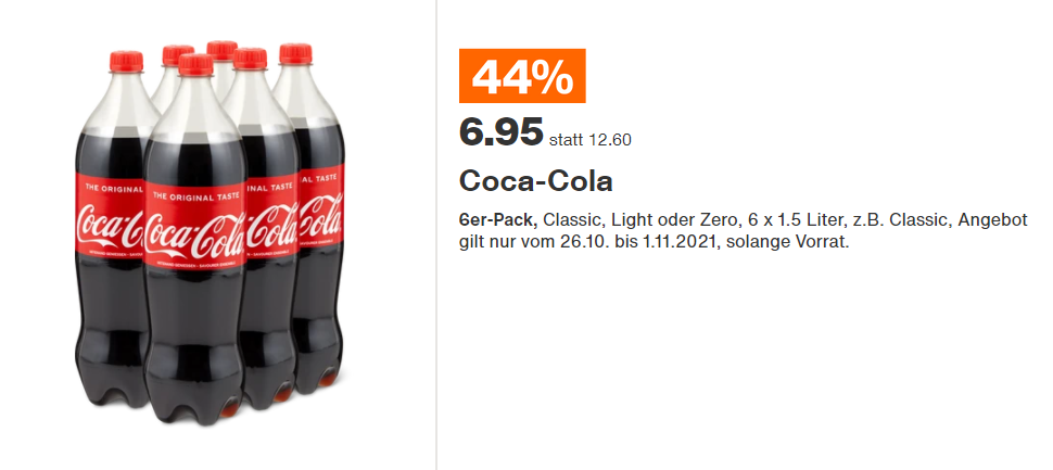 44% Rabatt bei Migros auf 6er-Pack Coca-Cola Classic, Light oder Zero, 6 x 1.5 Liter (Gültig bis zum 01.11.2021 nur solange Vorrat)