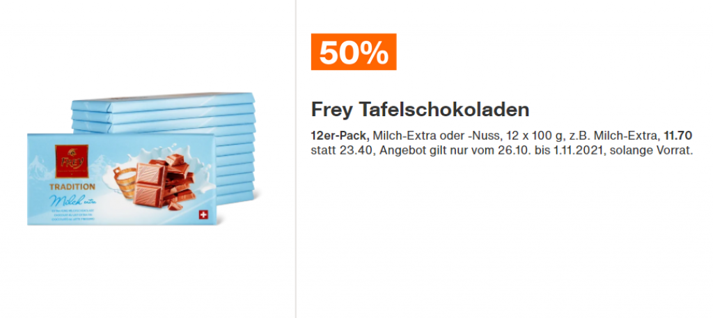 50% auf 12er-Pack Milch-Extra oder -Nuss Frey Tafelschokoladen bei Migros ( Gültig bis 01.11.2021 nur solange Vorrat)