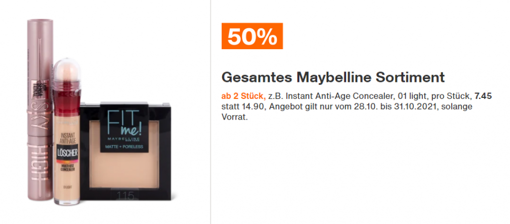 50% Rabatt auf das gesamte Maybelline Sortiment bei Migros (Gültig bis zum 31.10.21 nur solange Vorrat)