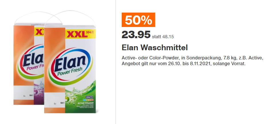 50% auf Elan Waschmittel bei Migros in Sonderpackung (Gültig bis zum 08.11.2021 nur solange Vorrat)