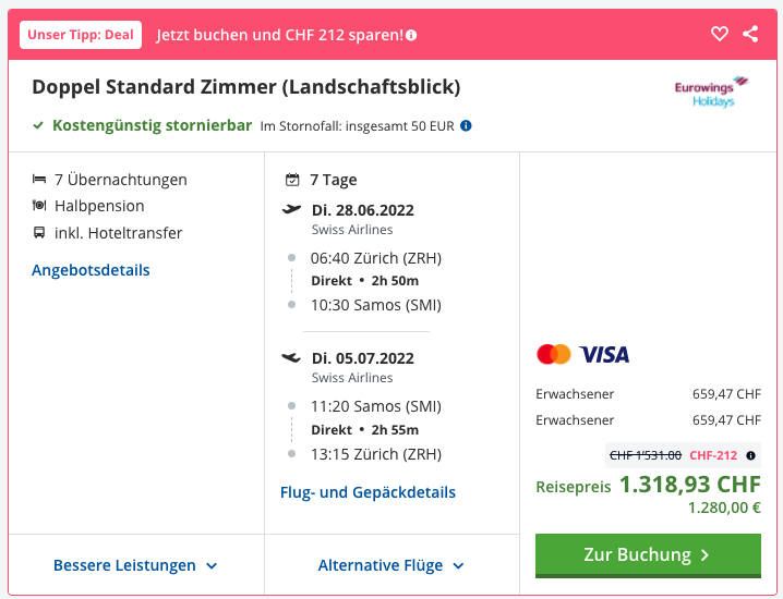 - Flug von Zürich mit Swiss nach Samos und zurück