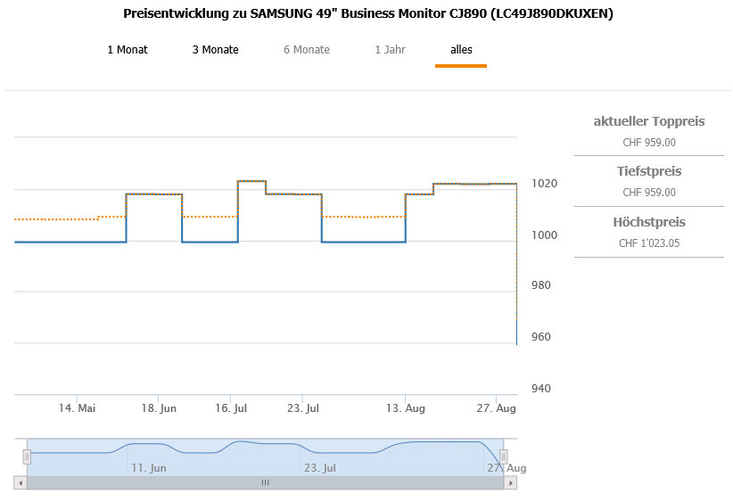 Gemäss toppreise gab es den Monitor bislang nie günstiger als für 1008.10 CHF, der zweitbeste Preis liegt aktuell bei 1022.- CHF.