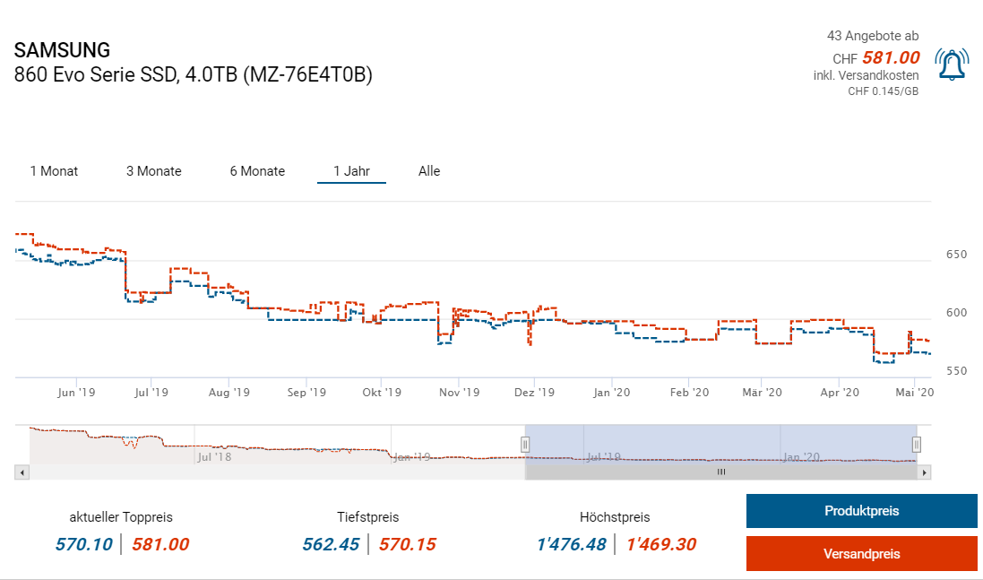 Bei digitec bekommt man derzeit die 4TB grosse SSD Samsung Evo 860 Basic mit der Speicherart TLC zum Bestpreis.