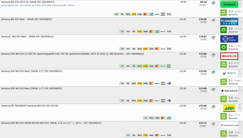 Bei microspot gibt’s mit dem Code SSD10 gerade die SAMSUNG 860 Evo Serie, 500GB SSD-Festplatte für CHF 89.10. Zweitbester Preis in der Schweiz beträgt CHF 124.90 Weniger als 99.- hat diese SSD-Festplatte noch nie gekostet.