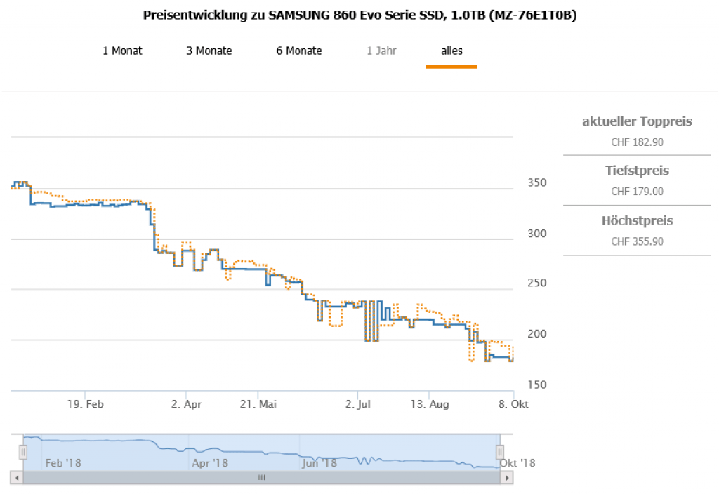 Gemäss toppreise gab es die SSD bislang nie günstiger als für 179.- CHF, der zweitbeste Preis liegt aktuell bei 182.90 CHF.