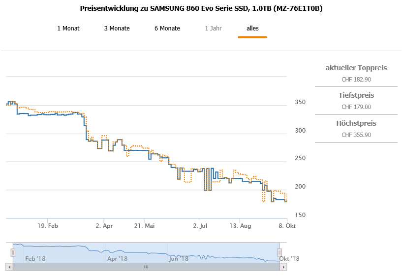 Gemäss toppreise gab es die SSD bislang nie günstiger als für 179.- CHF, der zweitbeste Preis liegt aktuell bei 182.90 CHF.