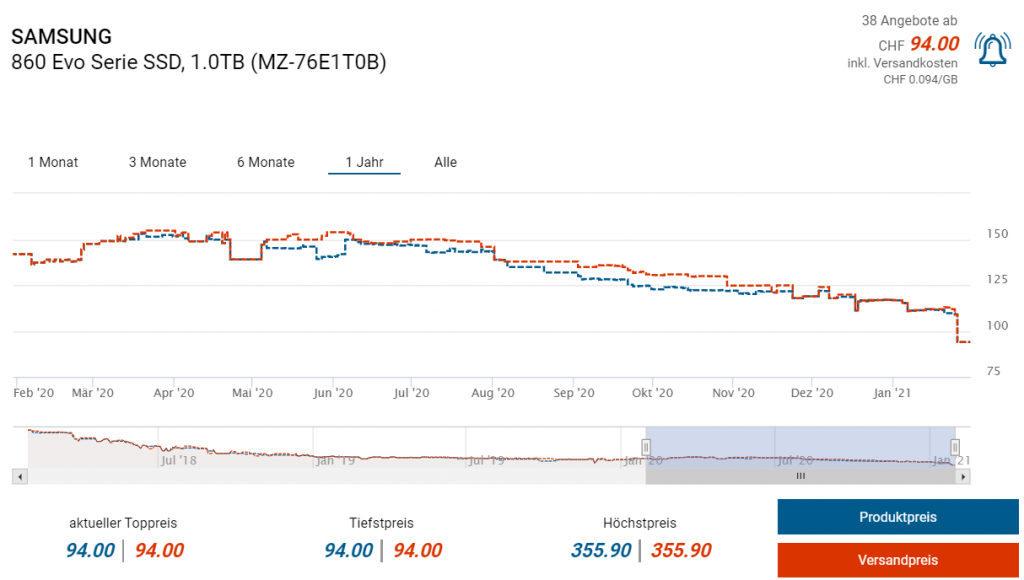 Was ich weniger lustig fand: Dass ich vor 7 Wochen noch 136.- dafür zahlte - 94.- ist ein Superpreis, erstmals dass ich die SSD unter 100.- sehe - Kaufempfehlung jetzt.