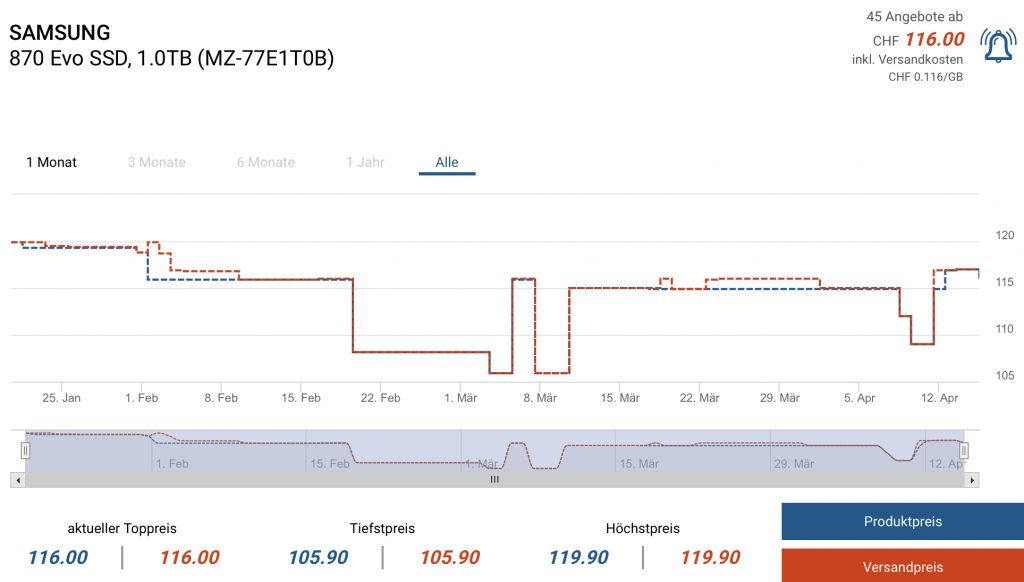 Bei amazon.fr gibt es aktuell die SAMSUNG 870 Evo SSD, 1.0TB für 77.50 EUR.