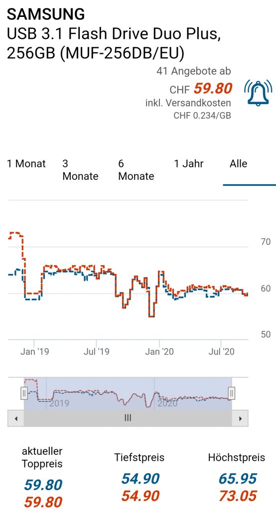 Bei Amazon gibts gerade den USB-Stick mit USB-A-Konnektivität von Samsung zum Aktionspreis von knapp 44 Franken. Laut toppreise solls diesen in der Schweiz nie günstiger gegeben haben.