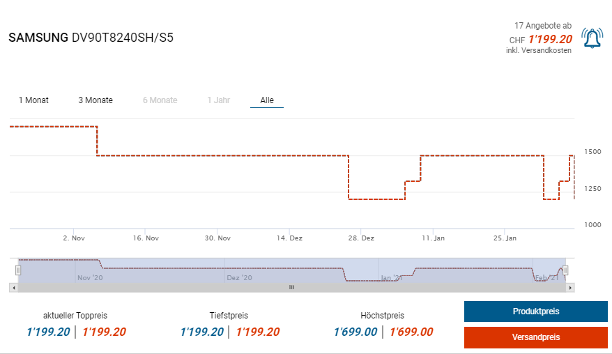 Bei Mediamarkt gibts zurzeit den Trockner DV90T8240SH/S5 von Samsung zum Bestpreis von knapp unter 1200 Franken, zweittiefster Preis laut toppreise liegt bei CHF 1499.-