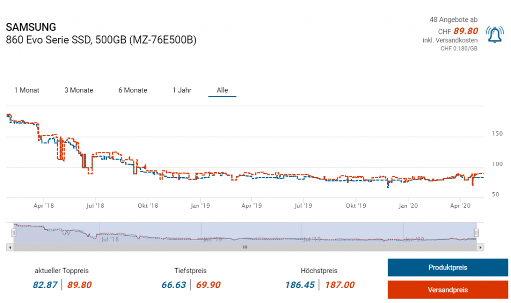 Im Blickdeal dieser Woche gibts die TLC-SSD Samsung Evo 860 in der 500GB-Ausführung wieder zum gleichen Bestpreis von ca. 69 Franken von vor 3 Wochen. Der zweitgünstigste Anbieter ist derzeit Amazon, da gibts die Festplatte für ca. 79 Franken.