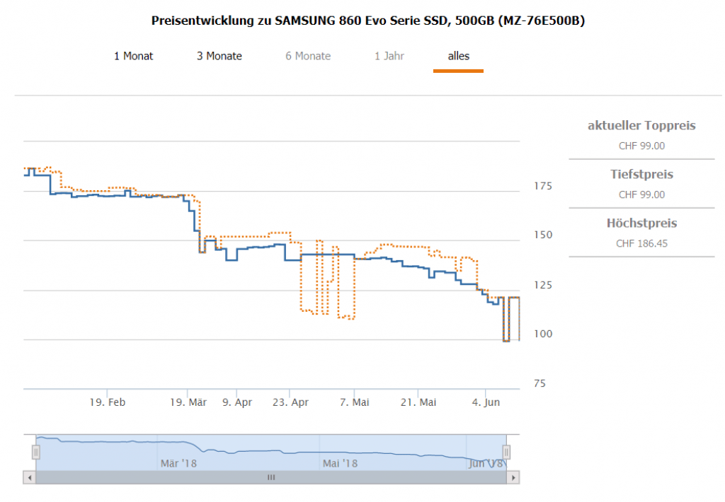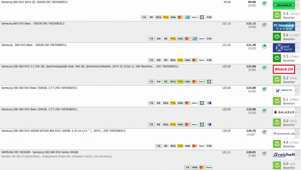 Zurzeit gibts bei microspot die SSD von Samsung zu einem guten Preis. Sie war letzte Woche auch mal CHF 99.- allerdings hatte niemand den Deal gepostet, was ich jetzt nun tue 😀 Zweitgünstigster Preis wäre CHF 121.15. Bin mir nicht sicher ob’s irgendeinen Gutschein gibt, mit dem man noch sparen kann…