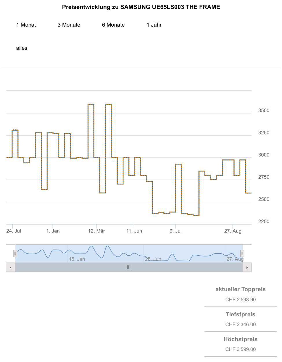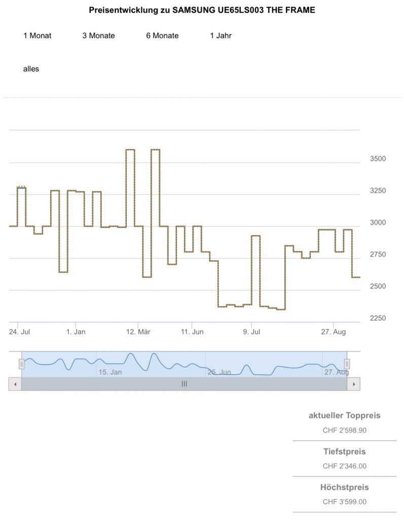 Den 65“ hingegen gab es gemäss toppreise noch nie günstiger als für 2346.- CHF und der zweitbeste Preis liegt aktuell bei 2598.90 CHF.